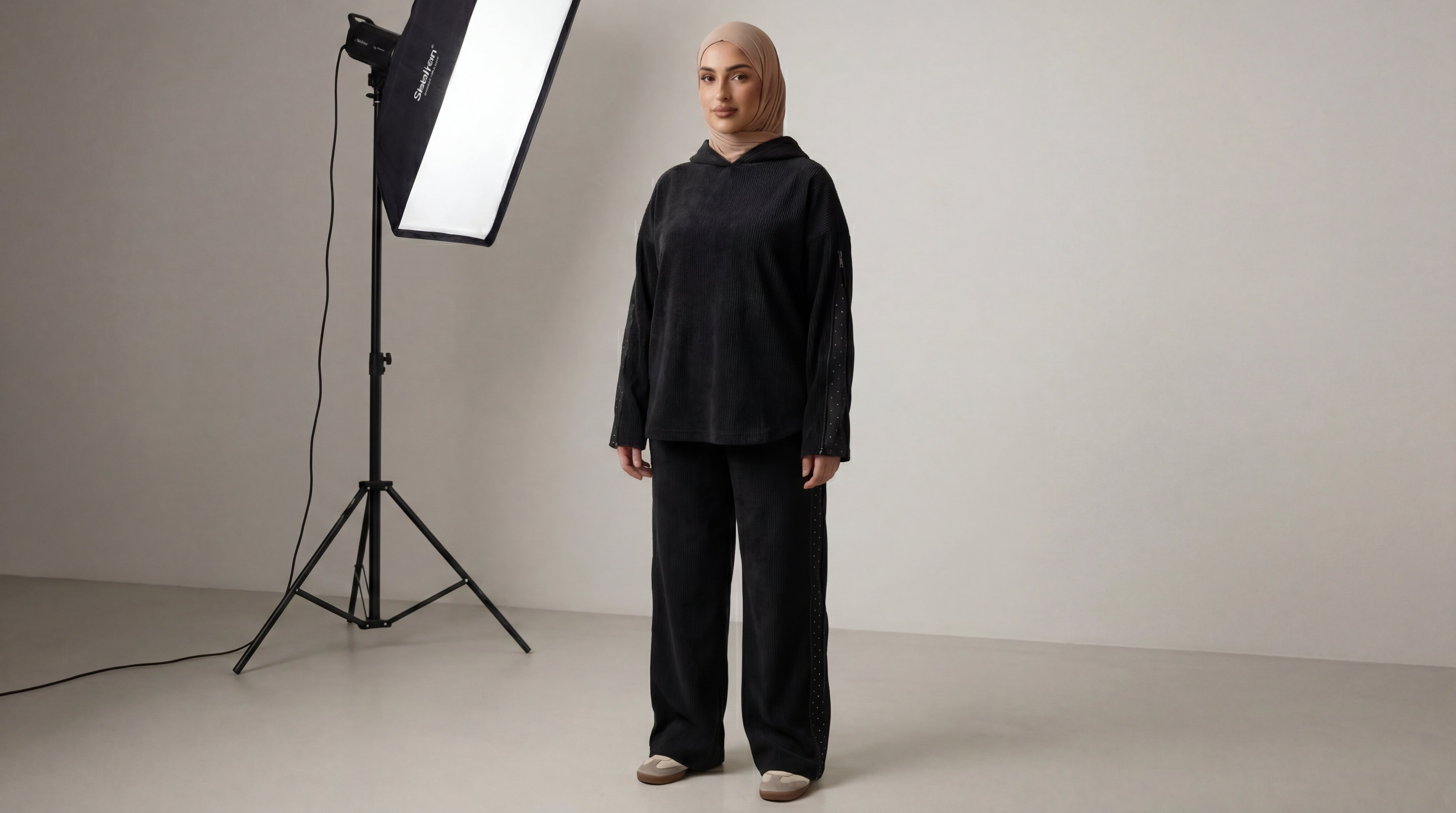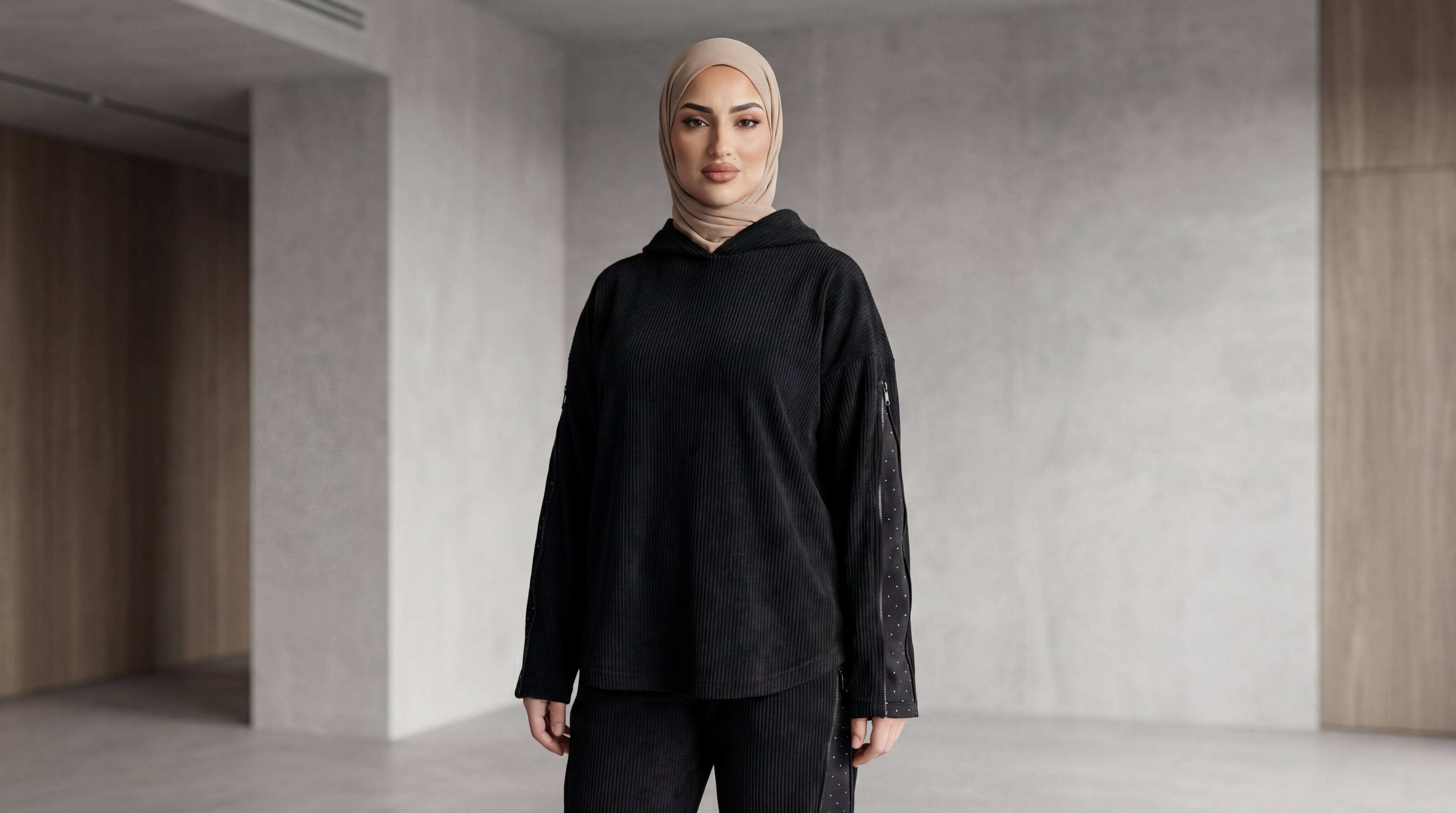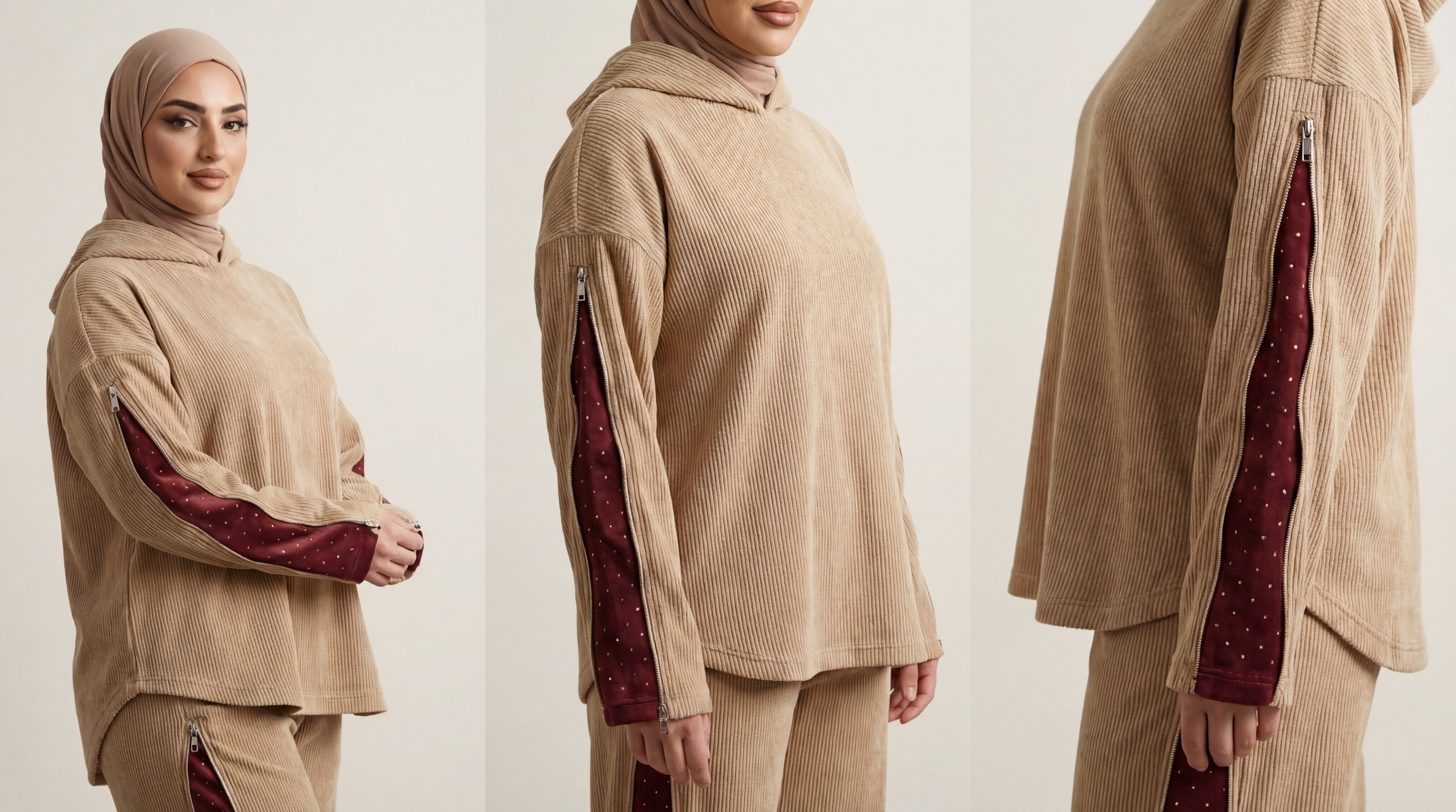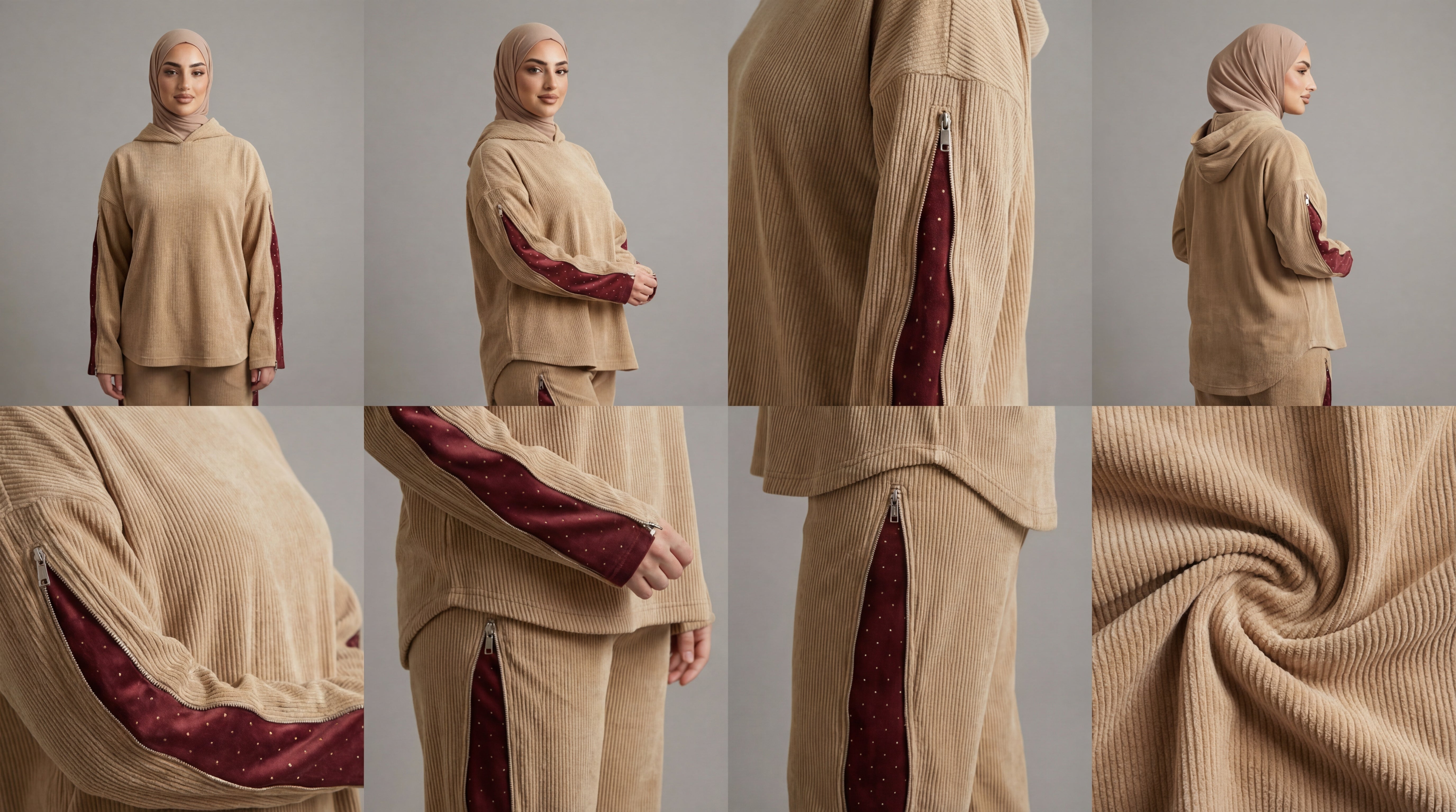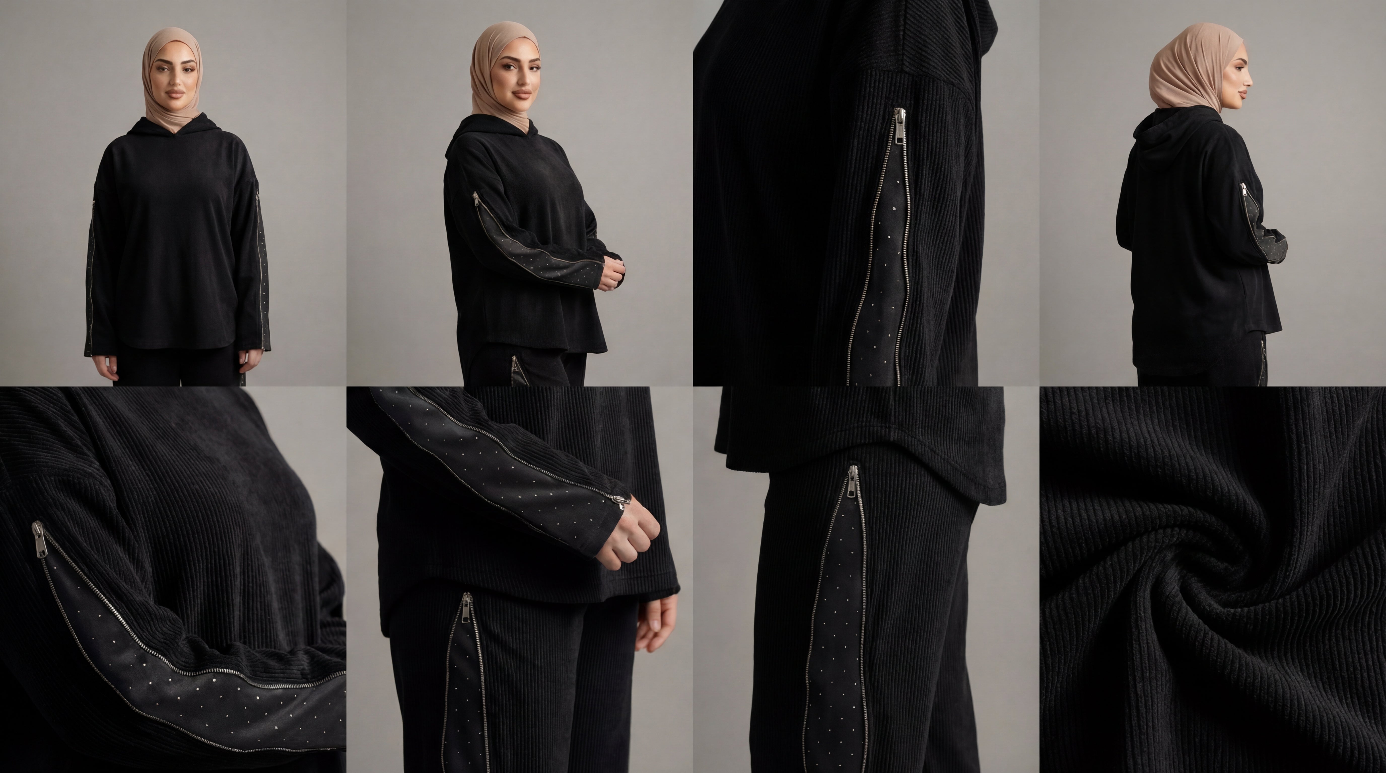 يتميز السوت بتفاصيل عصرية تضيف لمسة فخامة، حيث يحتوي على سوستة في الأكمام وجوانب البنطلون، مع قماشة ستراس داخليةتظهر بشكل أنيق لتعطي لمسة مميزة وراقية تزيد من جاذبية الإطلالة.